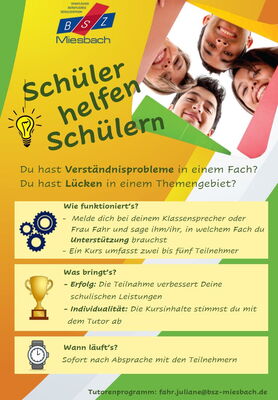 Im Rahmen der Klassensprecherversammlung wurde von Frau J. Fahr das Programm "gemeinsam.Brücken.bauen" vorgestellt und speziell auf die Möglichkeit des Tutorenprogramms hingewiesen. Hier besteht die Möglichkeit, dass leistungsstarke Lernende Unterstützungskurse für Schülerinnen und Schüler mit Lernrückständen anbieten. Nach dem Prinzip "Lernen durch Lehrern" helfen die Tutorinnen und Tutoren aber nicht alleine anderen, sondern erleben auch Selbstwirksamkeit und eigenen Kompetenzzuwachs. Sie werden eingesetzt, um z. B. im Rahmen einer Hausaufgabenbetreuung oder Nachbereitung von Unterrichtsstoff außerhalb der Unterrichtszeiten andere Lernende zu unterstützen. Ein herzlicher Dank geht an Frau Fahr, die die Betreuung und Organisation dieser sinnvollen und gewinnbringenden Aktivität übernimmt.