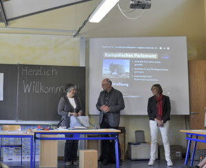 Im Anschluss an die Aufnahme des Podcast fand eine allgemeine Diskussion mit allen Auszubildenden der HT11A statt. Hier zeigte Frau Noichl unter anderem mit dem Vergleich "Die EU ist wie ein Melkschemel" die verschiedenen Rollen und Zusammensetzungen des Europaparlaments, des Europäischen Rats und der EU Kommission auf. Sie zeigte den Schülern, dass auch diese Organe untereinander sich nicht immer einig sind, z.B. wenn es um die Frage der Tagungsorte des EU-Parlaments geht. Das EU-Parlament würde diese gerne ausschließlich auf einen einzigen Tagungsort beschränken - Brüssel oder Straßburg, nicht mehr beides. Der Europäische Rat ist hier aber dagegen.