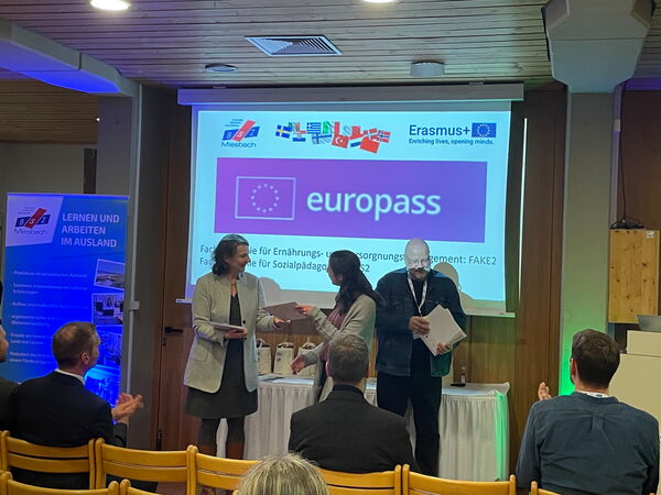 Im Rahmen dieses Abends wurden durch Frau Carola Ilsanker von der Regierung von Oberbayern sowie Herrn Andreas Heidenreich vom ISB-Fachbereich Erasmus+ die sog. Europässe verteilt - ein Dokument, welches die im Ausland erworbenen Kompetenzen dokumentiert (vgl. Bild).